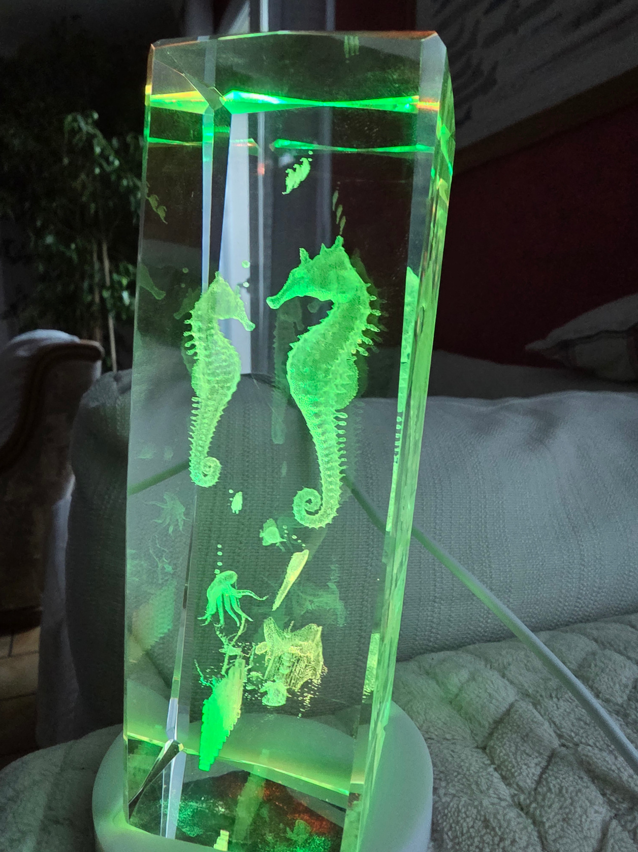 Aujourd’hui, je mets au point un petit système de lumière sous un "cristal" acheté à la cité de la mer à Cherbourg en Cotentin.